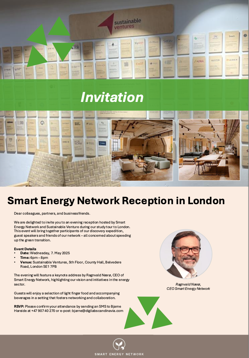 We are delighted to invite you to an evening reception hosted by Smart Energy Network and Sustainable Venture during our study tour to London. This event will bring together participants of our discovery expedition, guest speakers and friends of our network – all concerned about speeding up the green transition.