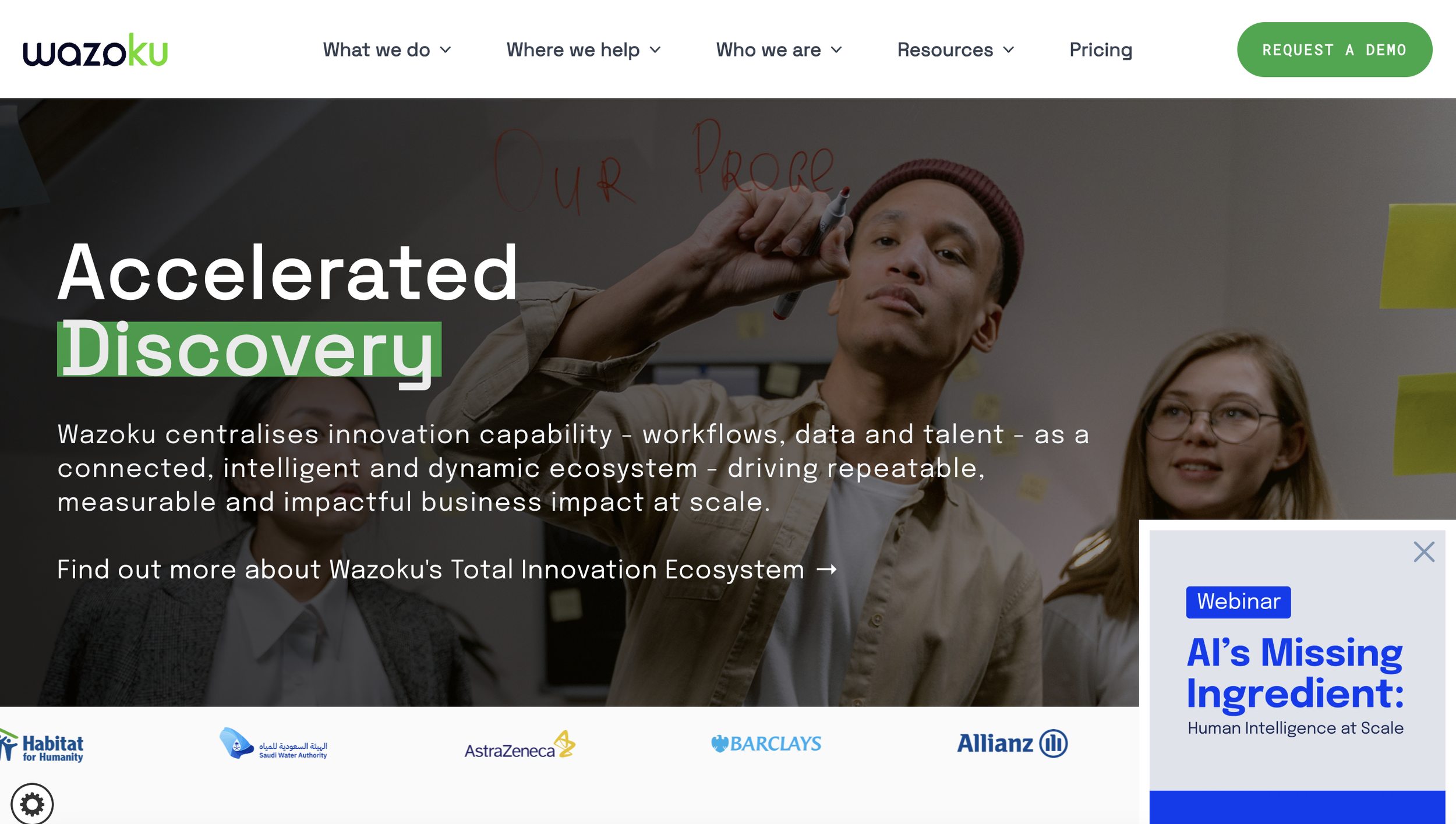 Wazoku is a UK-based innovation platform company helping organizations solve complex challenges through crowdsourcing and open innovation. Founded in London in 2011, Wazoku enables businesses, public sector bodies, and research organizations to access global communities of problem-solvers through their platform. Their approach connects companies with innovators worldwide to generate sustainable solutions, drive operational improvements, and accelerate the transition to a greener economy.