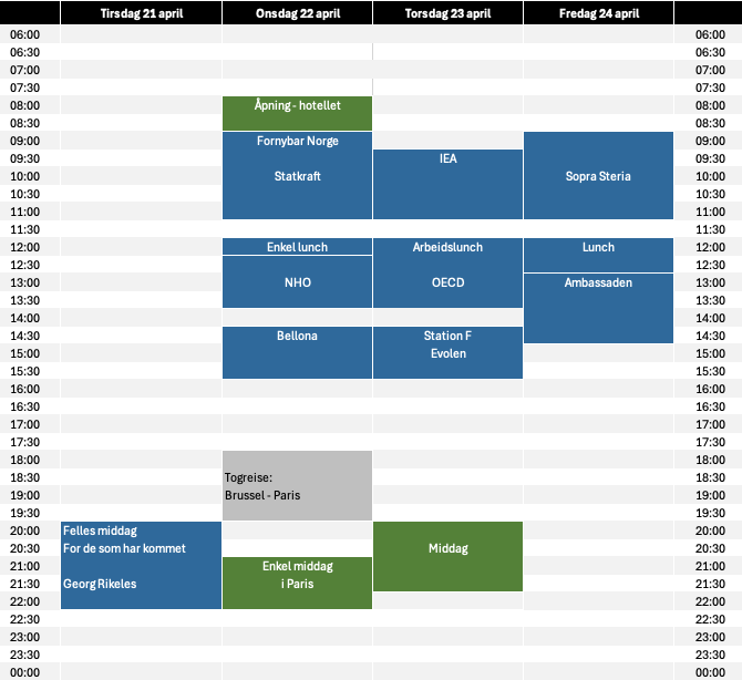 Tirsdag 21. april starter vi med en uformell felles middag. Her vil Georg Rikeles gi oss en rykende fersk oppdatering på det politiske landskapet i EU. Onsdagen starter med møter hos NHO, Bellona, Statkraft og Fornybar Norge, før vi tar toget til Paris – en by som har befestet sin posisjon som en ledende europeisk innovasjonsby og nøkkelaktør i Europas energiomstilling.
